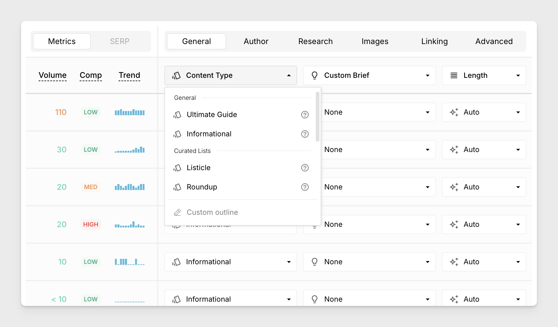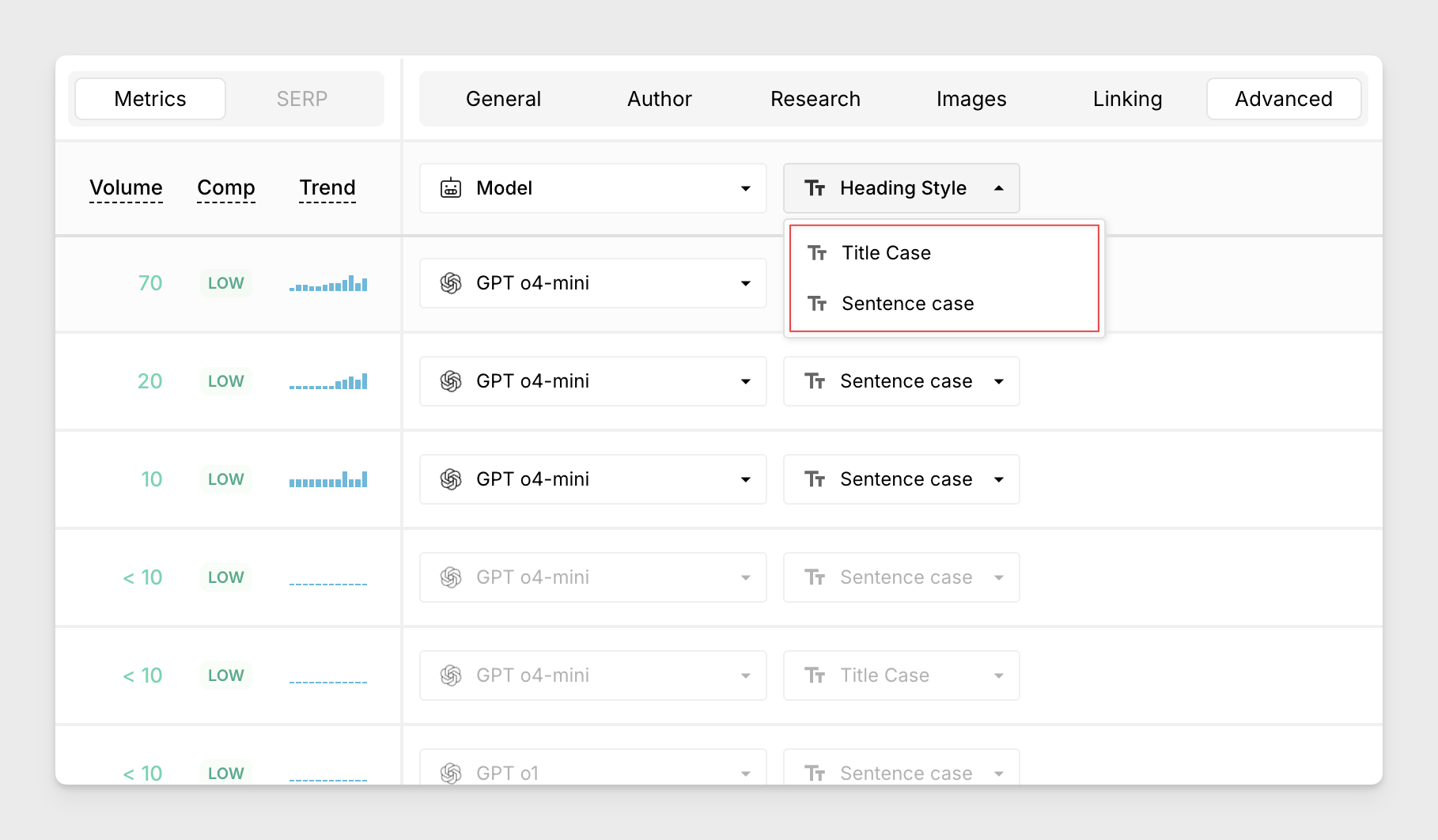 When using the built-in content types, the AI Agent will automatically generate a suitable outline. You can instruct the writing agent to use either Title Case or Sentence Case when creating headings.