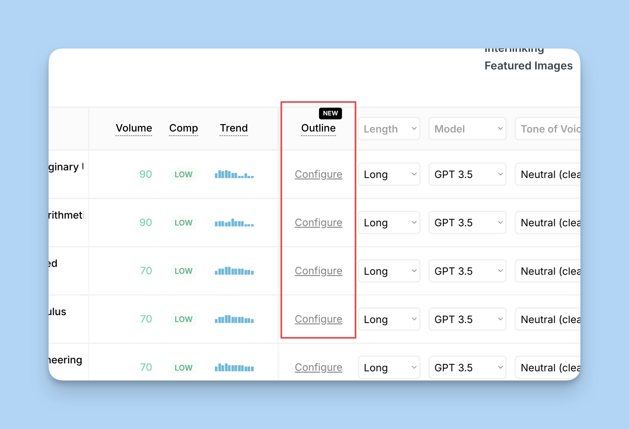 To open the "Outline Editor" panel for any article, click "Configure" under the Outline column: