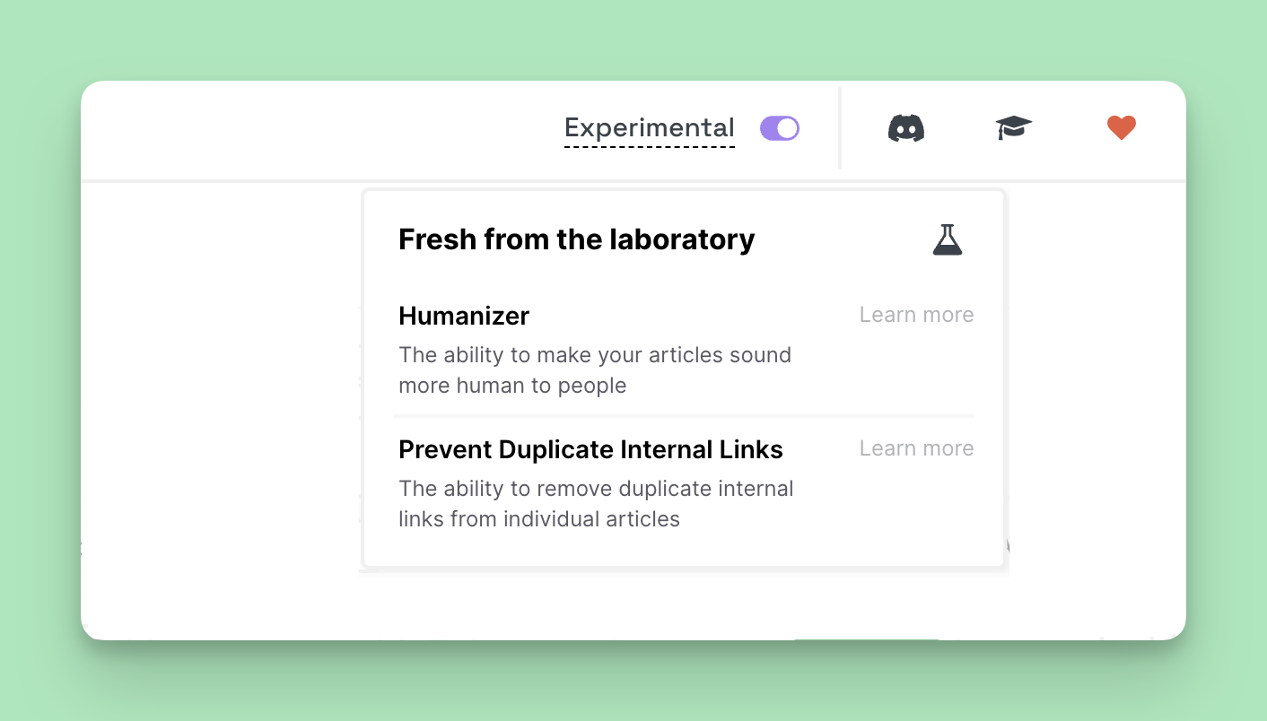 Experimental features are accessible from the top navigation bar