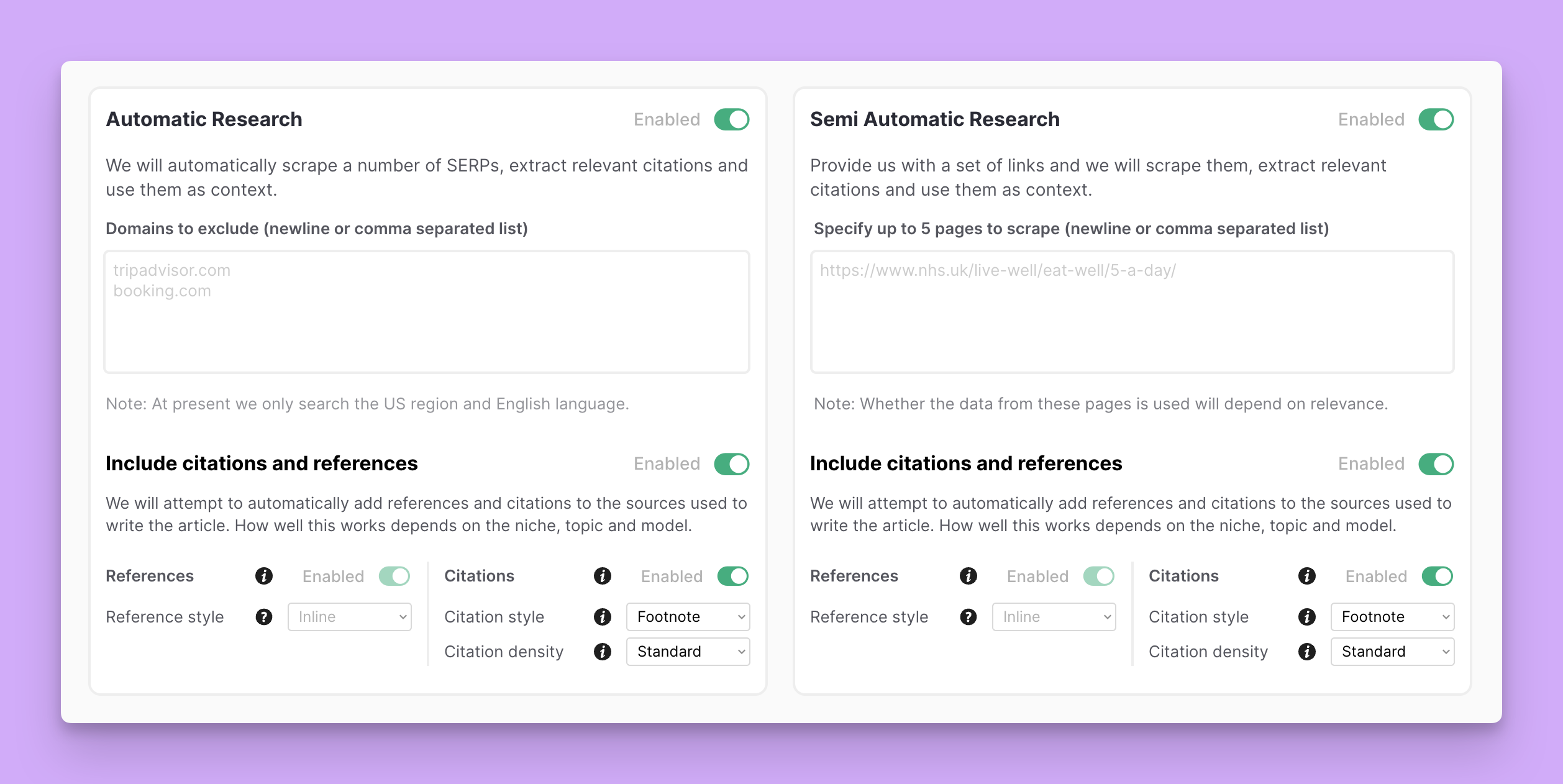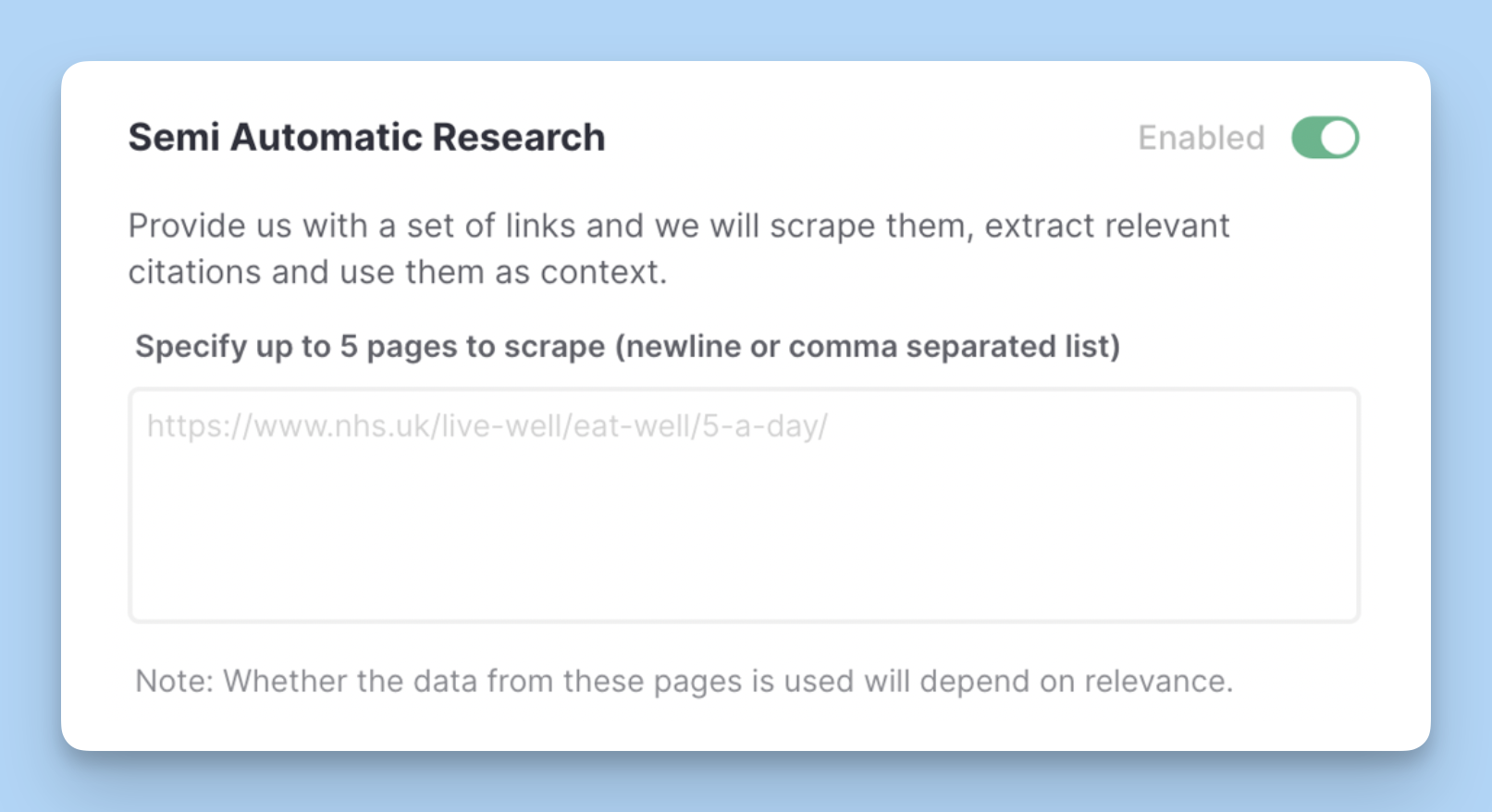 Automatic mode allows you to scrape the SERPs automatically based on the topics and keywords in your articles. This will retrieve the latest and highest ranking sources of information on a topic, providing valuable context for the writer and extract relevant facts and figures to use in your article.