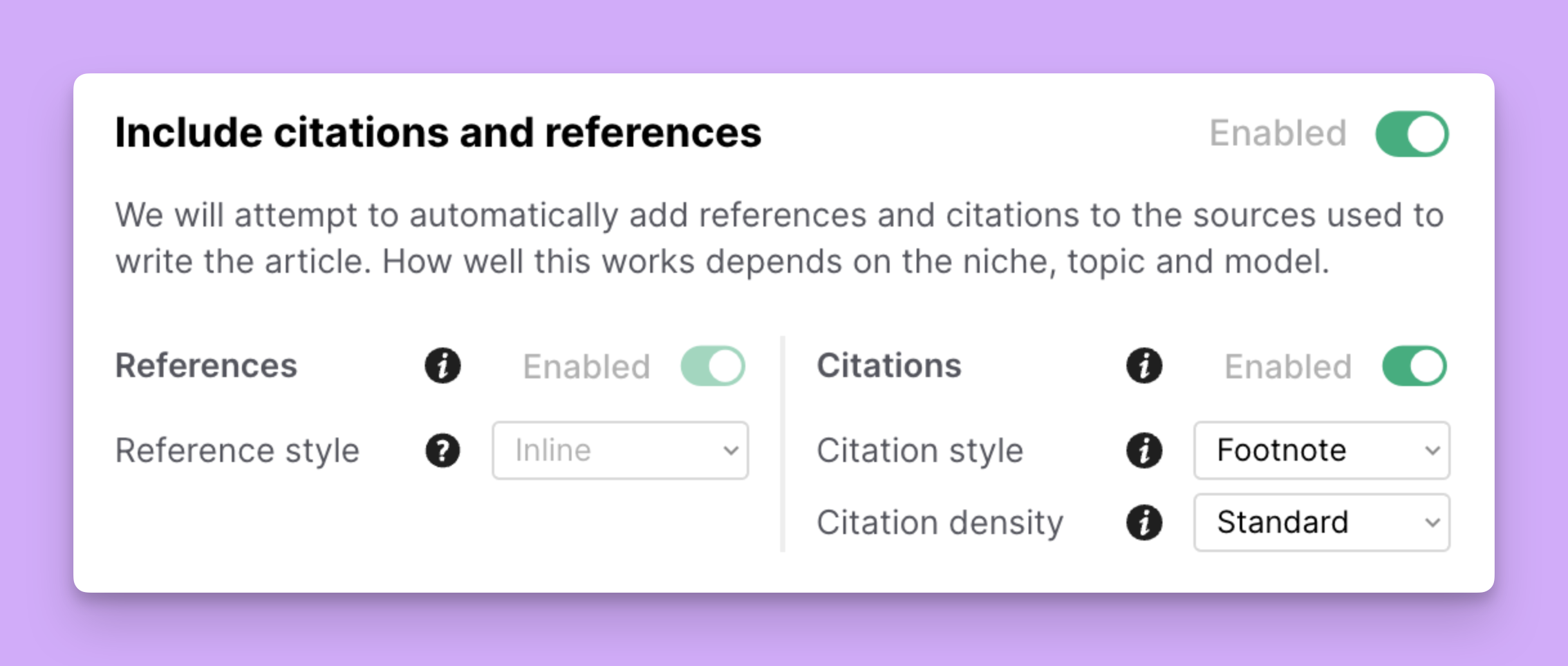 For all researched articles, you have the option to include references and citations to the content that the research originates from.