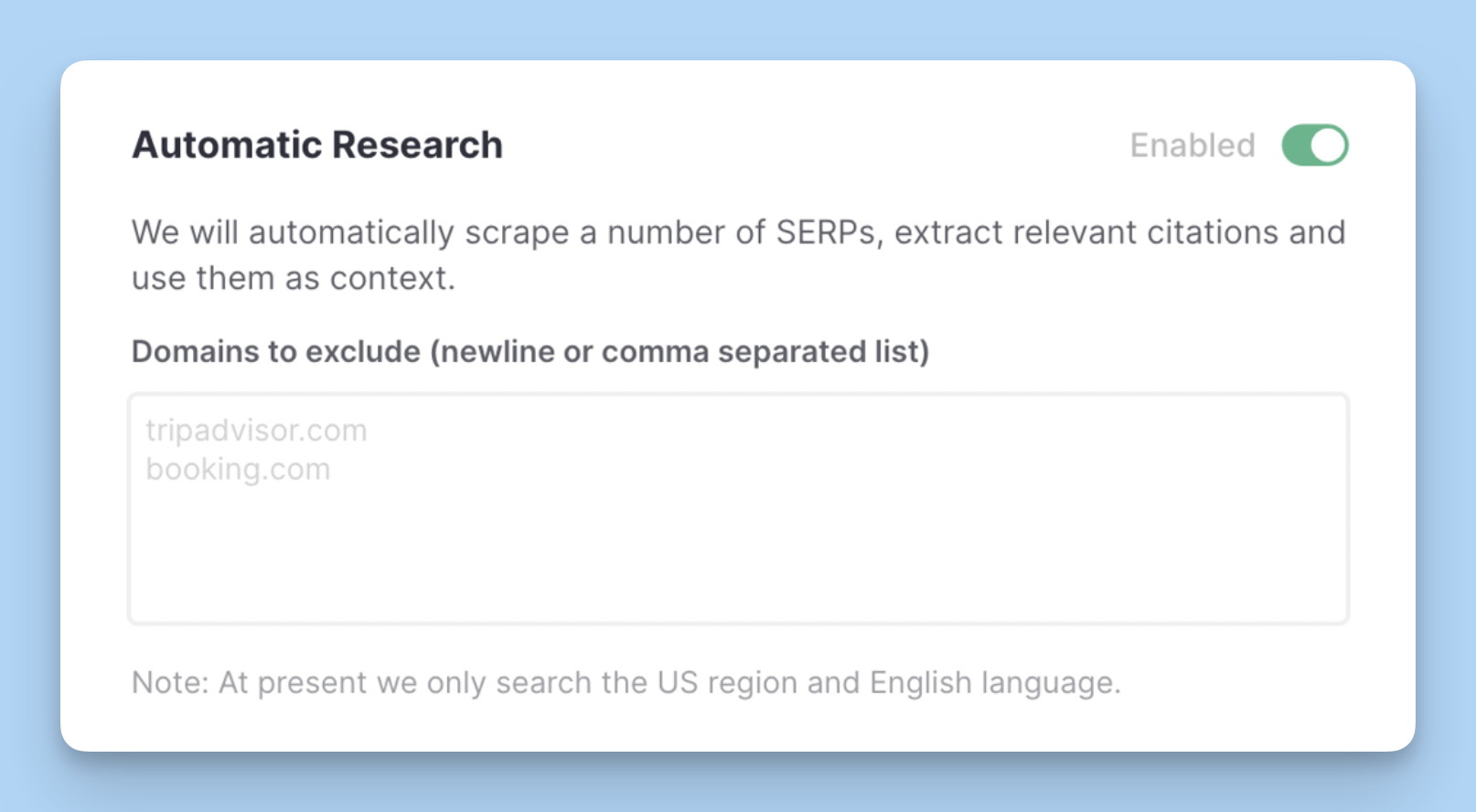 Additionally, you can add specific domains to exclude from research, so you can avoid things like competitors, reddit and so on.