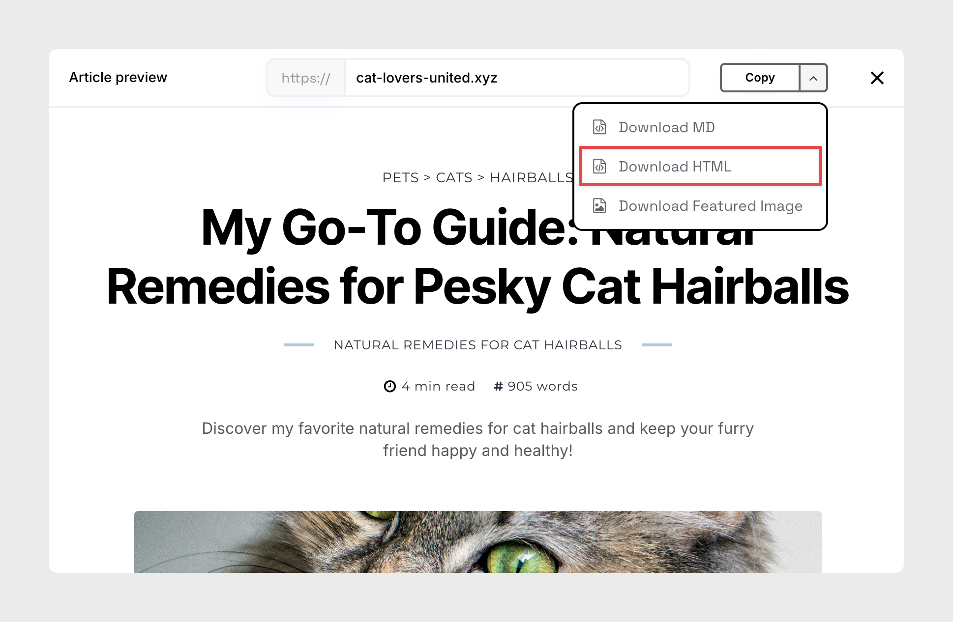 HTML is the markup language of the internet and it can be useful in many scenarios - ie, you have a custom built website and want to import the raw html, or if your editor of choice allows you to paste html with some basic formatting. Whatever your use case, it's super easy to export your content in raw html form.