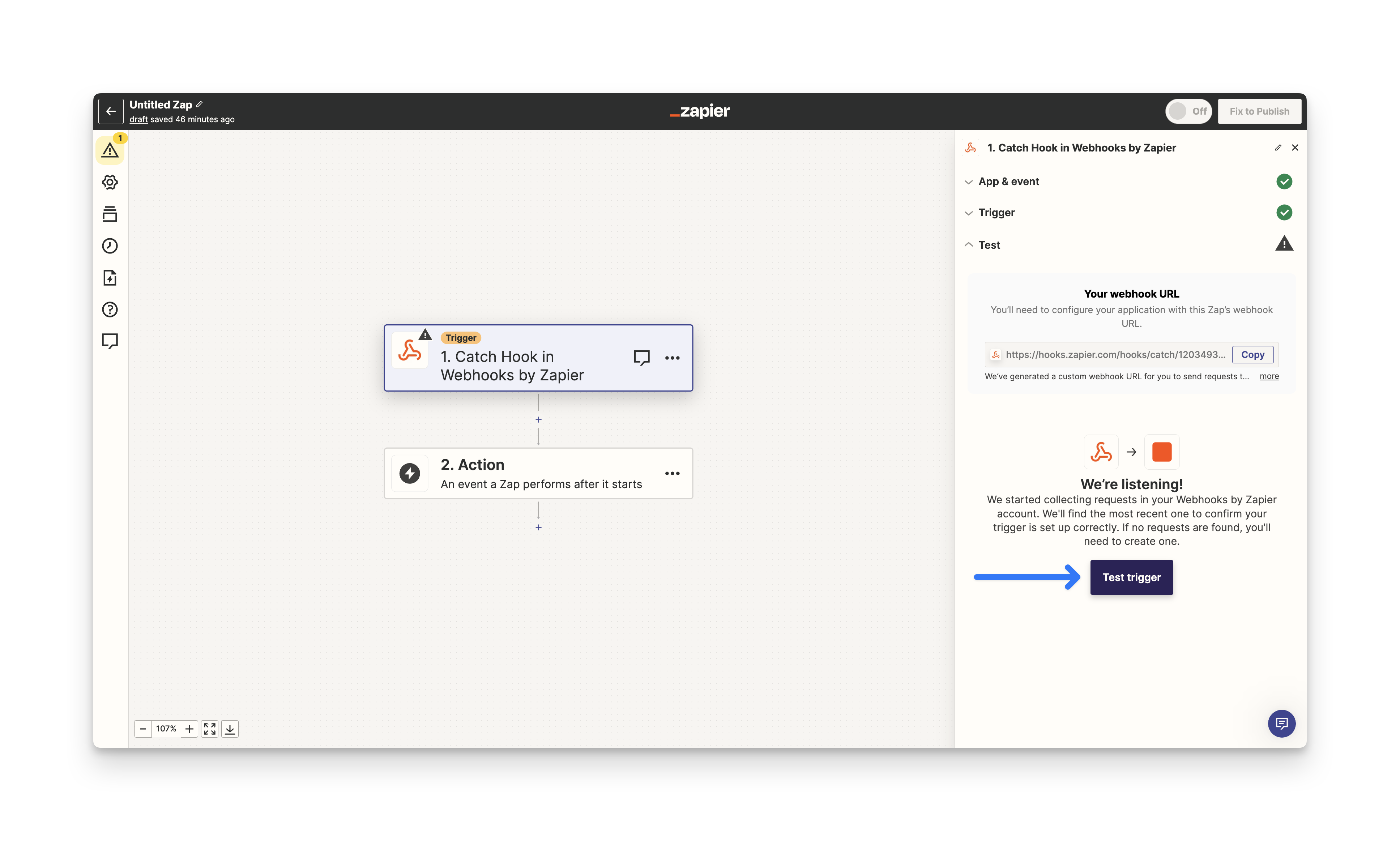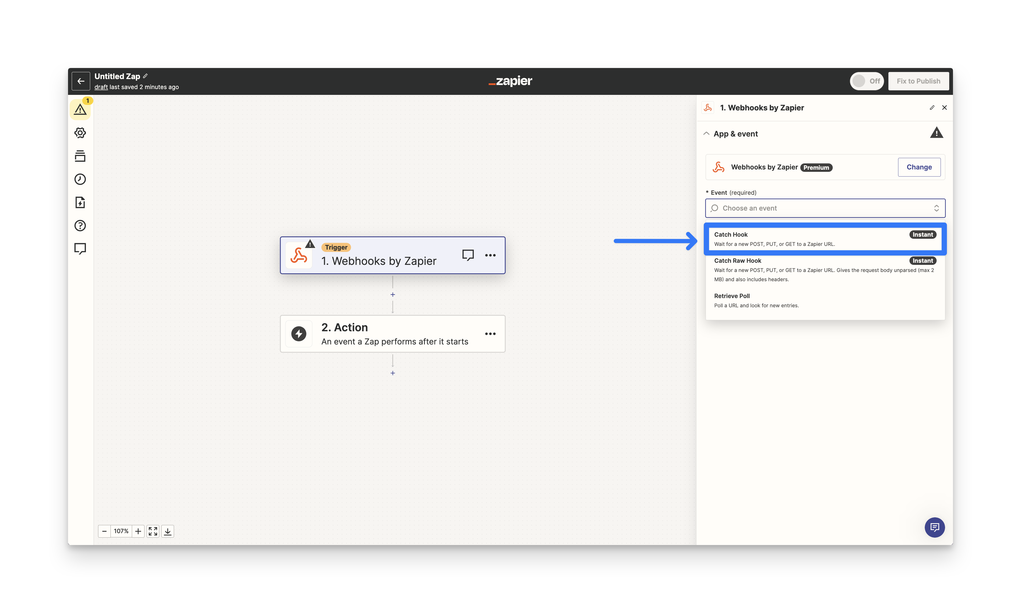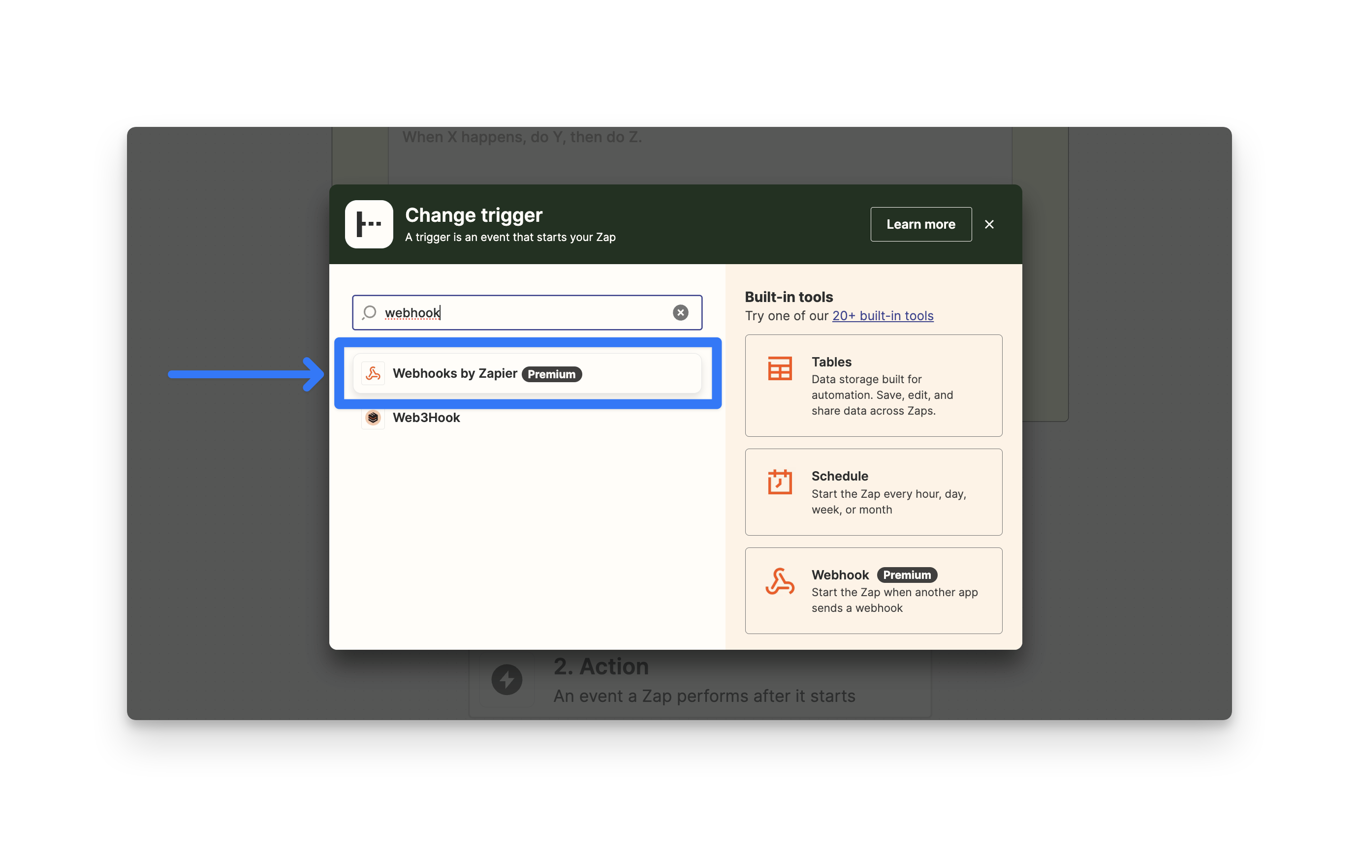 - Click the trigger node and search for the Webhooks by Zapier trigger.