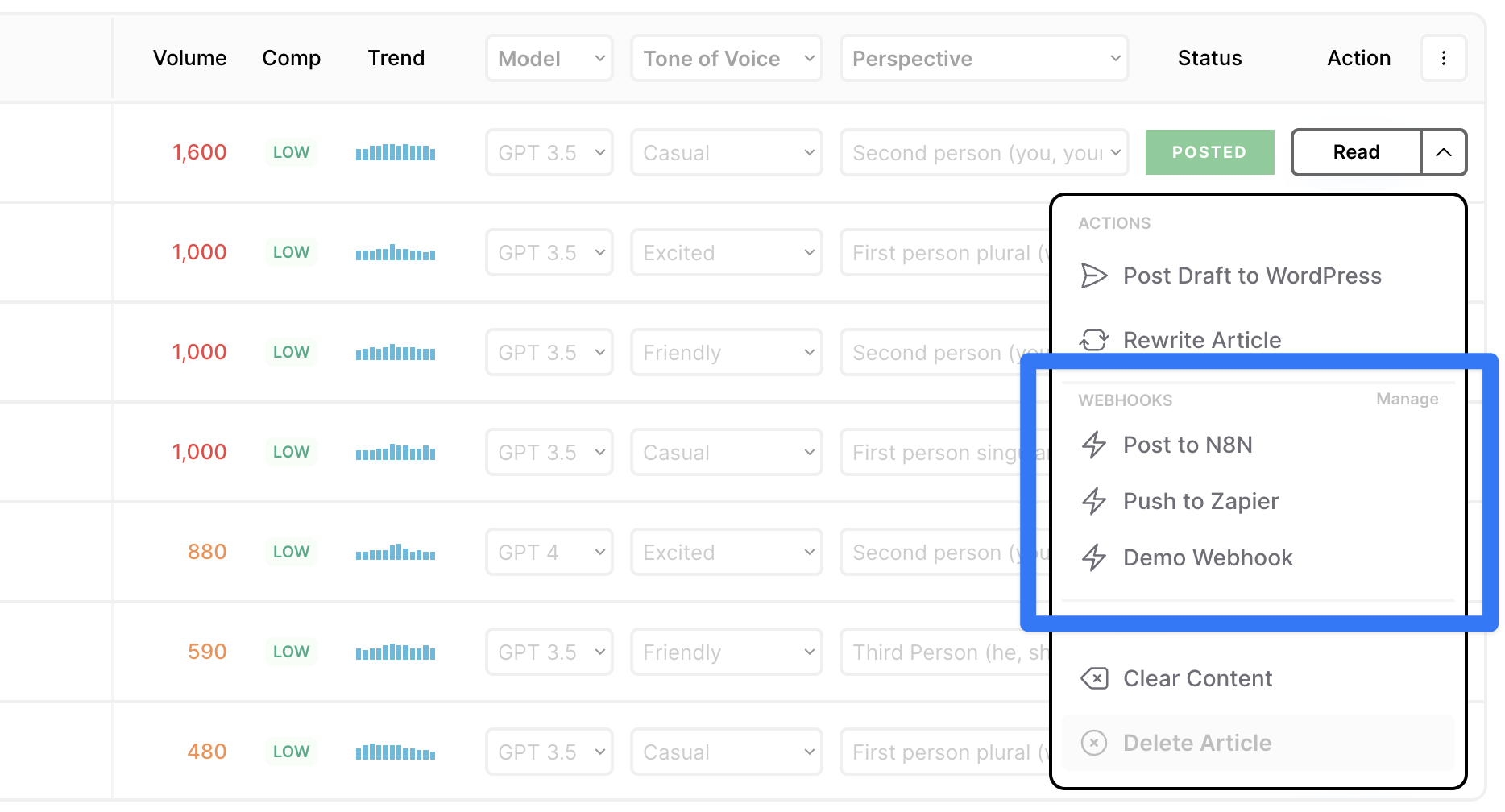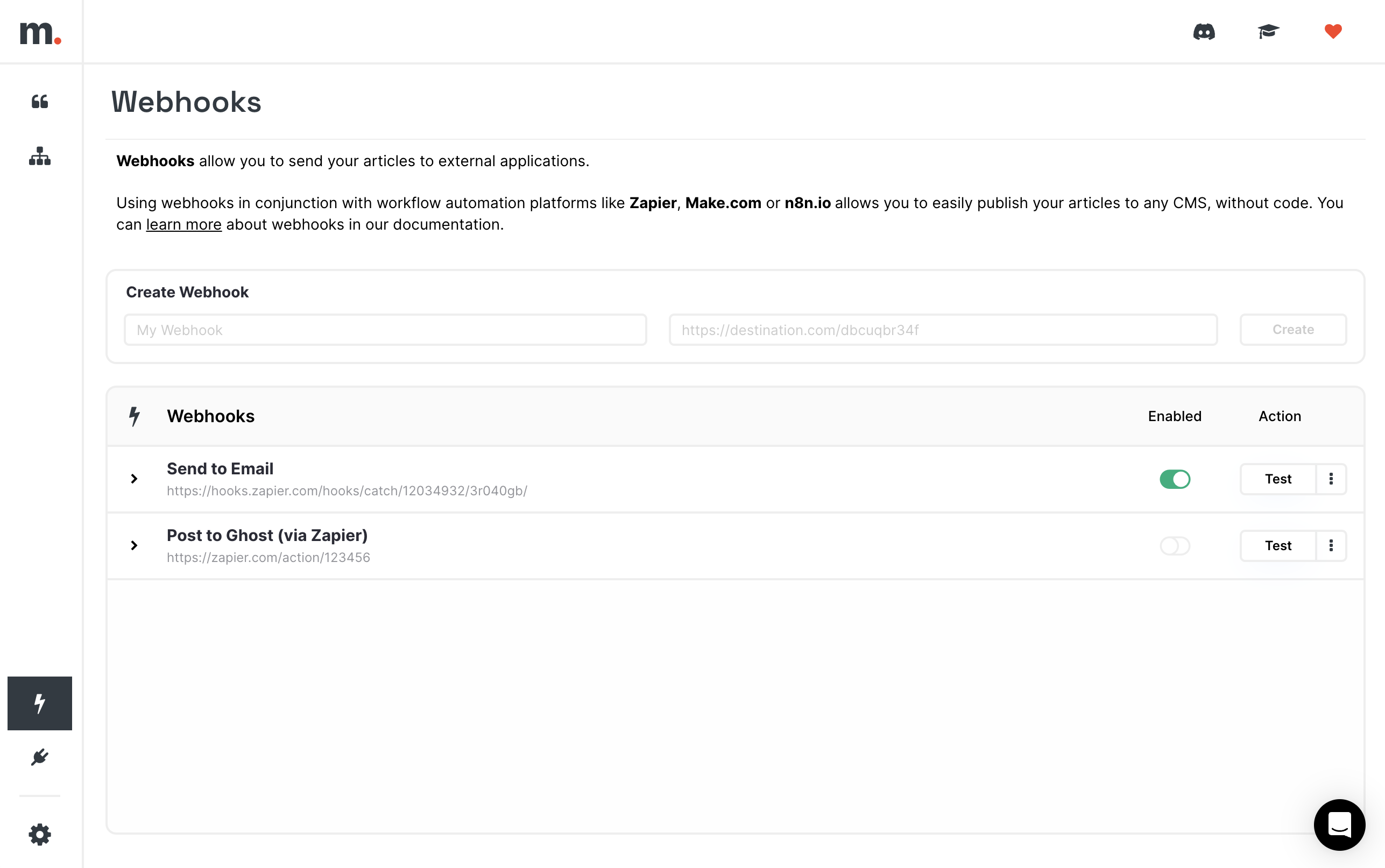 Using webhooks in conjunction with workflow automation platforms like Zapier, Make.com or n8n.io allows you to easily publish your articles to any CMS, without code.