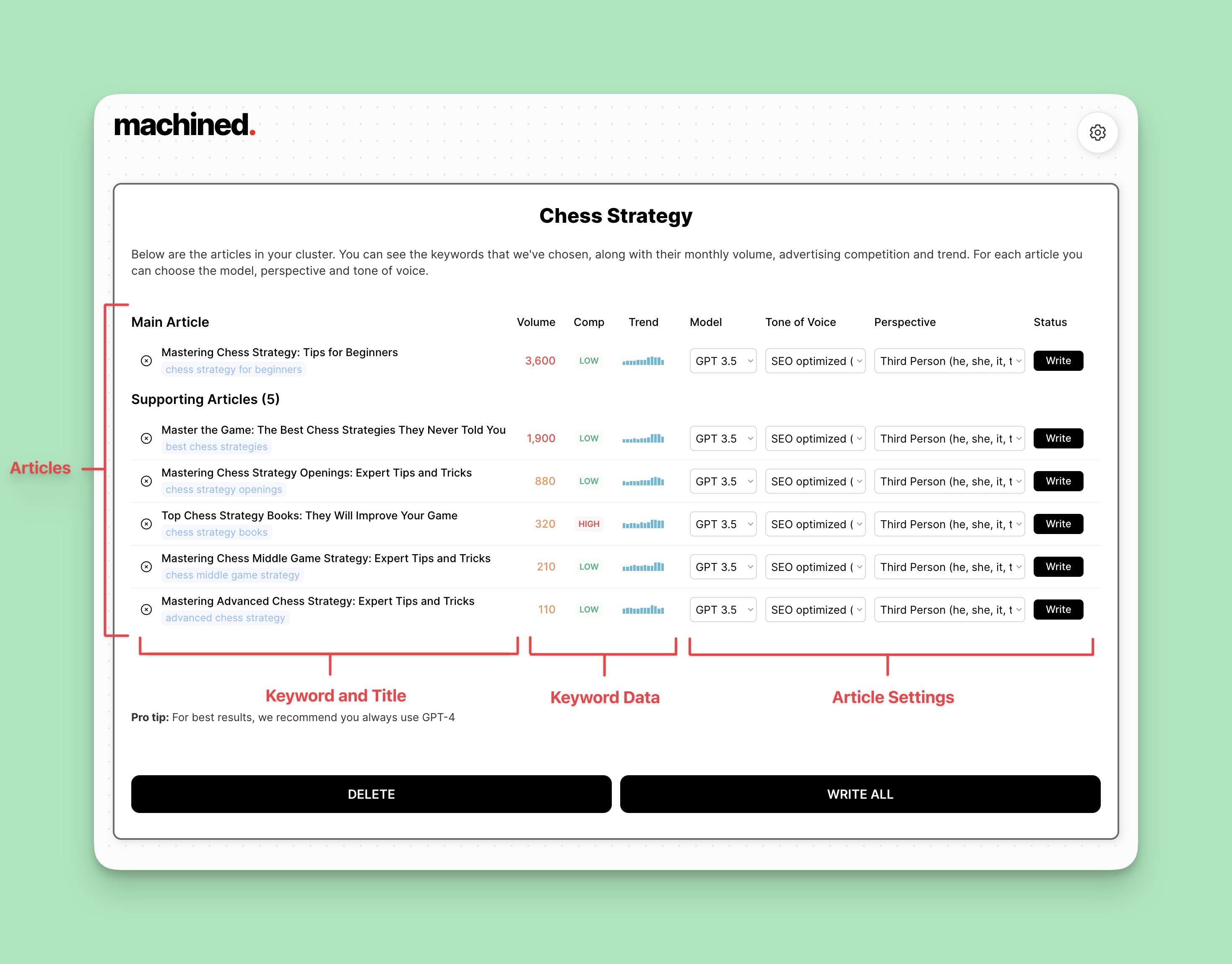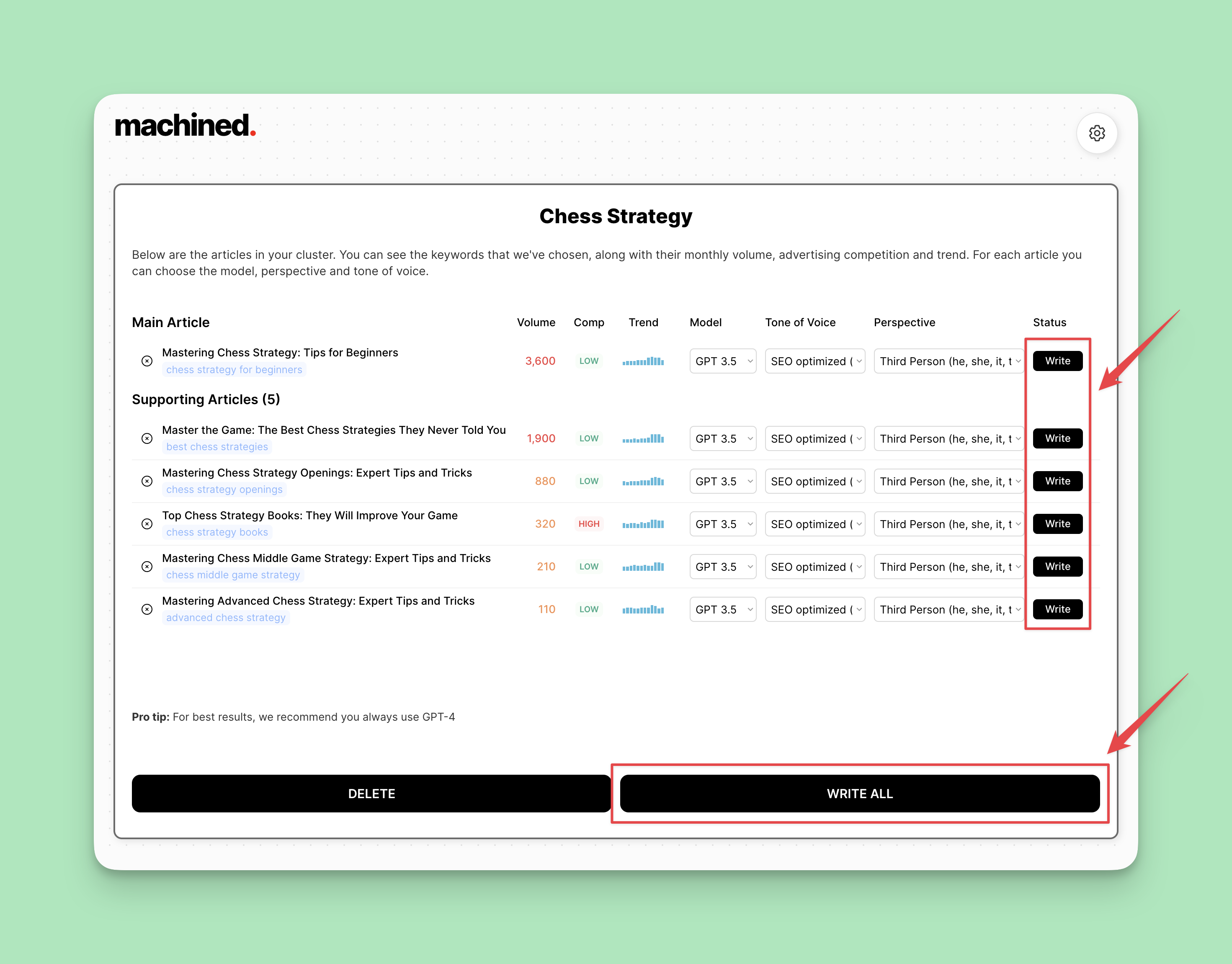 As you can see above, a cluster will be comprised of one main article and a number of supporting articles, each one backed by a specific keyword, for which you can see keyword data including monthly search volume, competition and trend.
